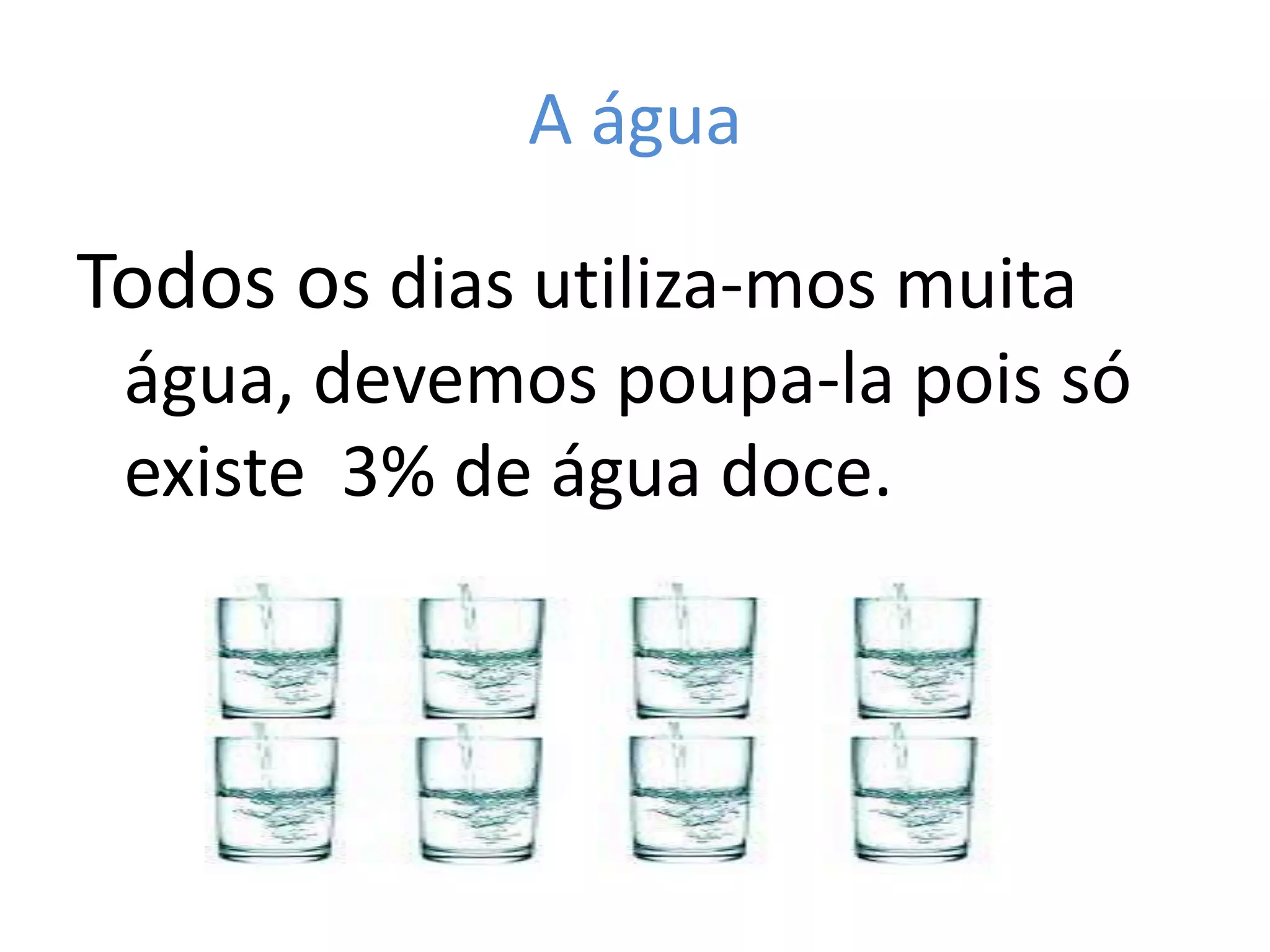 A água é um recurso precioso, mas apenas 3% da água do planeta é doce e disponível. Devemos poupar a água fechando torneiras quando não estiver em uso, evitando desperdícios, e não poluindo rios, para garantir o acesso a esse recurso essencial à vida.