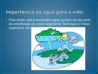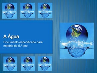 A água é essencial para a vida e pode existir nos estados físicos de sólido, líquido e gasoso. A água em estado sólido é representada pelo gelo, em estado líquido por mares, rios e lagos, e em estado gasoso pelo vapor d'água. A água pode mudar entre esses estados através de processos como fusão, solidificação, condensação e vaporização.