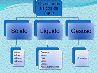 O documento descreve como os alunos aprenderam sobre o ciclo da água em uma aula de Estudo do Meio utilizando o programa PowerPoint. Eles aprenderam sobre as diferentes formas como a água existe na Terra, os estados físicos da água e como ela circula no planeta através do ciclo da água.
