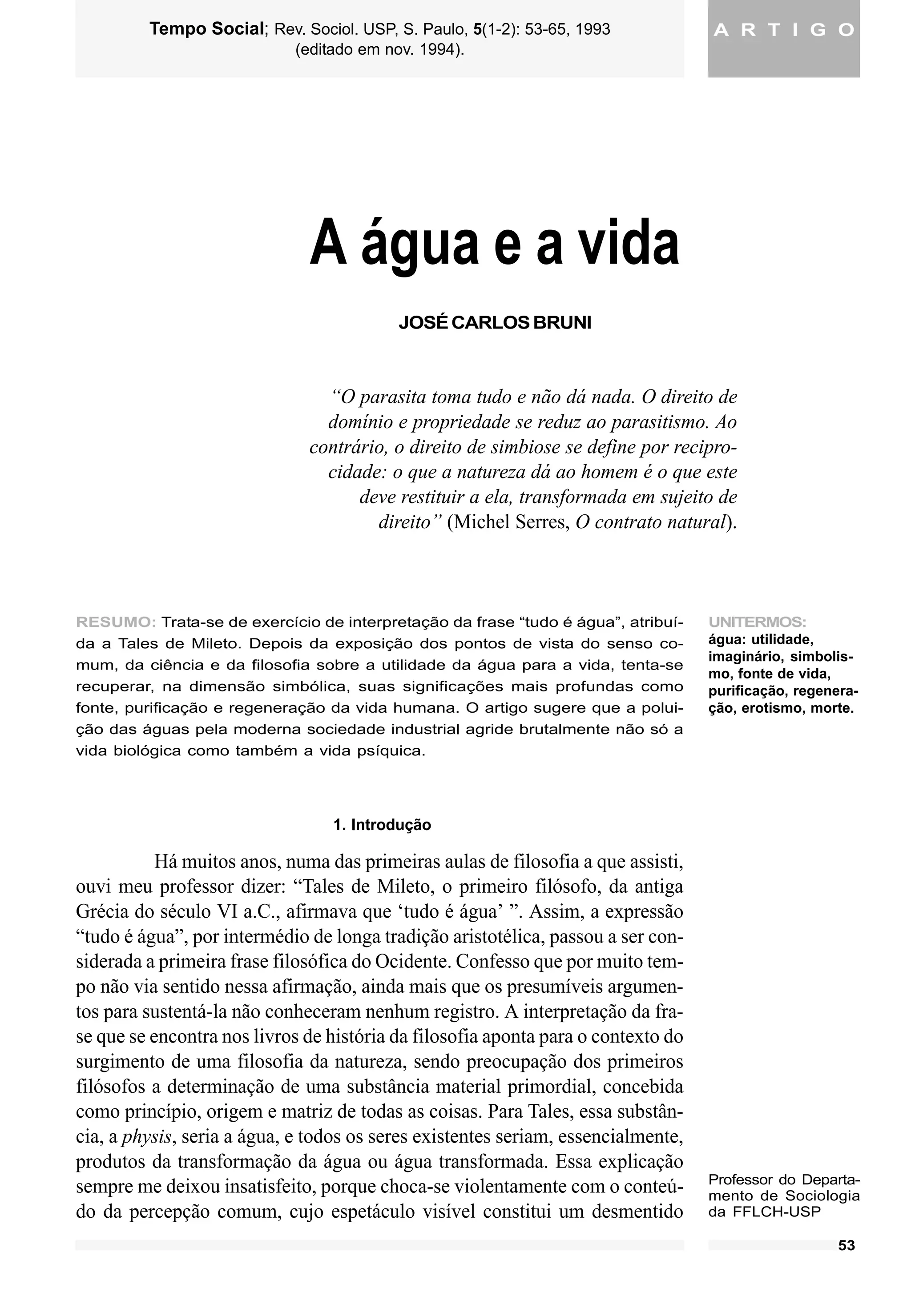 O documento discute a importância fundamental da água para a vida, tanto biológica quanto simbólica. Primeiro, apresenta evidências científicas de que a água é essencial para a sobrevivência de todos os seres vivos e para as funções biológicas básicas. Em seguida, sugere que a água também tem significados profundos no nível simbólico, como fonte de purificação e regeneração para a vida humana.