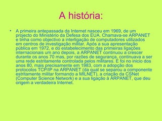 A Internet teve origem em 1969 com o projeto ARPANET do Departamento de Defesa dos EUA para interligar computadores de centros de pesquisa militar. Nos anos 80, a adoção dos protocolos TCP/IP na ARPANET deram origem à verdadeira Internet e seu crescimento acelerou com a criação de estruturas de coordenação. Em Portugal, a Internet chegou na década de 80 para a comunidade acadêmica e científica, mas só se popularizou nos anos 90.