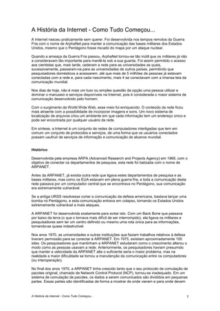 1) A Internet surgiu da ARPANET, desenvolvida pelo governo dos EUA durante a Guerra Fria para manter comunicações militares mesmo sob ataque nuclear. 2) A ARPANET evoluiu para a Internet ao adotar o protocolo TCP/IP e permitir acesso a universidades e pesquisadores. 3) A Internet cresceu exponencialmente com a World Wide Web e serviços como o Yahoo que ajudaram usuários a encontrar informações.