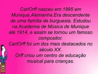 Carl Orff foi um compositor alemão que atuou nas óperas de Manheim e Darmstadt no início de sua carreira. Sua obra mais famosa foi Carmina Burana, de 1937. Orff também compôs músicas para filmes e apresentou seu último trabalho, "De temporum fine Comoedia", no Festival de Música de Salzburgo em 1973. Infelizmente, Orff faleceu em 1982 aos 86 anos de idade.