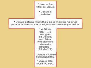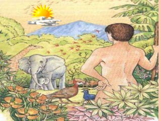1) O documento descreve a criação do mundo por Deus em sete dias, incluindo a criação do homem e da mulher, Adão e Eva. 2) Adão e Eva desobedeceram a Deus ao comerem o fruto proibido, introduzindo o pecado no mundo. 3) Como resultado, Deus os expulsou do Jardim do Éden e colocou maldições sobre a serpente, Eva e Adão.