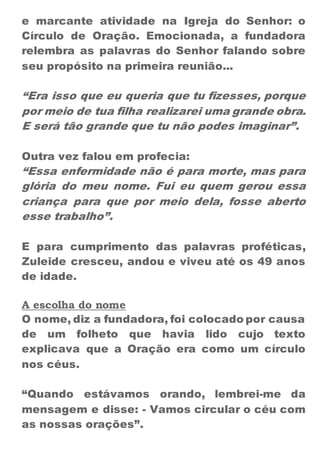 O Círculo de Oração foi fundado em 1942 em Recife por Albertina Bezerra Barreto para orar pela cura de sua filha Zuleide. Começou com sete mulheres orando e hoje se expandiu para todo o Brasil e outros países. Seu nome veio de um folheto que explicava que a oração era como um círculo nos céus, e o grupo continua "circularizando" o céu com orações.