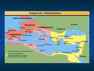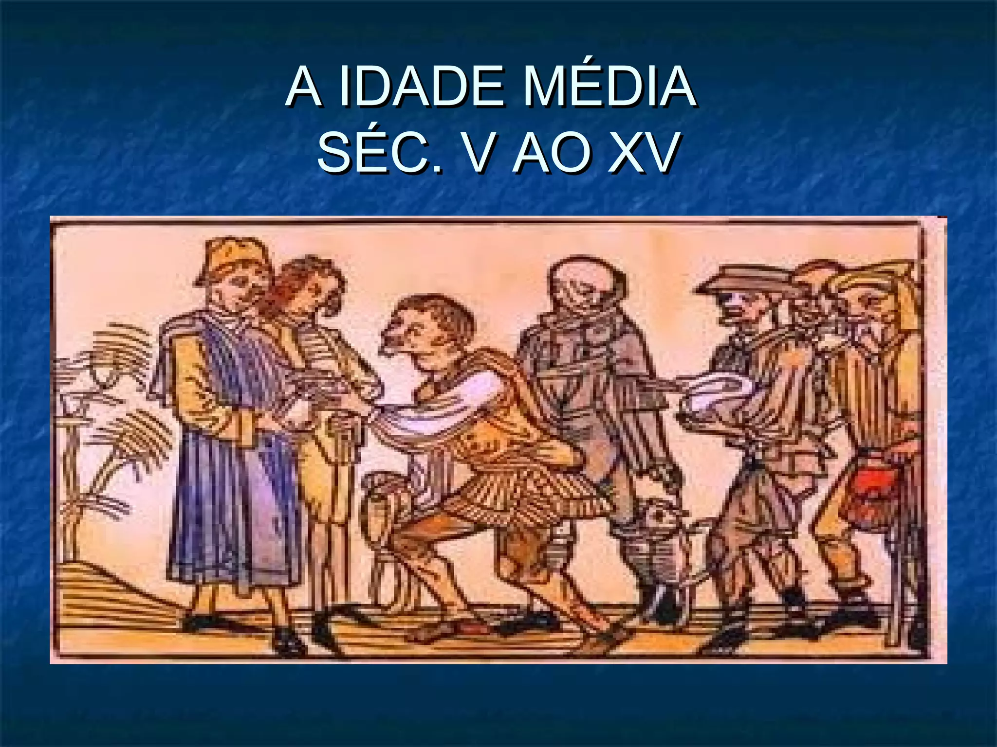 O documento descreve o período da Idade Média entre os séculos V e XV na Europa. A queda do Império Romano do Ocidente levou à invasão de povos bárbaros e ao surgimento do feudalismo. A Idade Média foi dividida em Alta e Baixa, caracterizadas por fatores como a expansão árabe e o crescimento das cidades. O feudalismo estruturou a sociedade em senhores, vassalos e camponeses através da propriedade da terra.