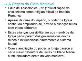 O documento descreve a Igreja na Idade Média, incluindo a origem do clero medieval, a estrutura eclesiástica e movimentos reformistas. O poder da Igreja cresceu através de alianças com tribos bárbaras. O clero era dividido em secular e regular. As cruzadas foram influenciadas pelo crescimento populacional e apoio a Bizâncio, mas falharam em reconquistar Jerusalém de forma permanente.