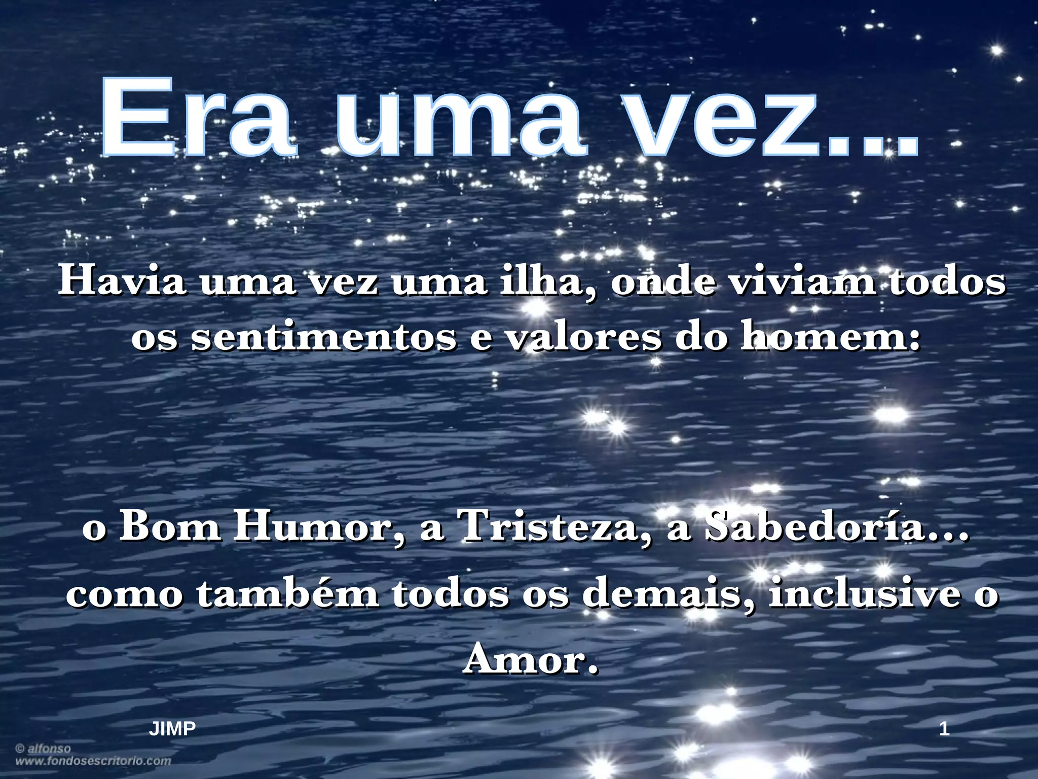 1) Uma ilha onde viviam sentimentos e valores humanos estava afundando e todos os sentimentos partiram em barcos, exceto o Amor.