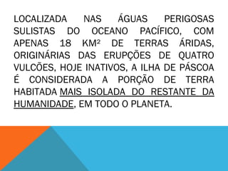 Localizada no Oceano Pacífico, a Ilha de Páscoa é a porção de terra habitada mais isolada do planeta, distante 3000-3200km de qualquer outra terra. Sua pequena área de 18km2 originou-se de erupções vulcânicas e é conhecida pelas enormes estátuas de pedra chamadas Moais, esculpidas em forma humana e espalhadas pela ilha.