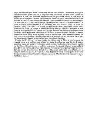 3) Após batalhas na ilha, Silver é derrotado, mas consegue fugir com parte do tesouro.