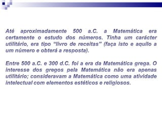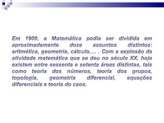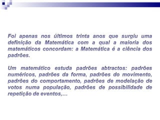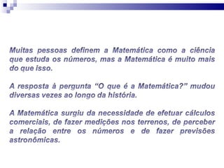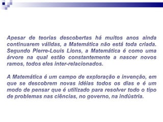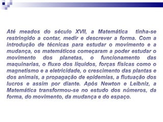 O documento discute como a matemática é essencial e onipresente em nosso dia-a-dia, ainda que invisível, e explica diversos fenômenos naturais através de equações e teorias matemáticas, como o voo, a queda dos corpos, os movimentos planetários, previsões do tempo e probabilidades.