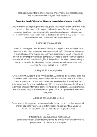 O documento destaca a importância do domínio do inglês como a língua franca do mundo contemporâneo, facilitando a comunicação global e impulsionando oportunidades profissionais. Além disso, aborda como o inglês enriquece experiências de viagem e acesso a recursos educacionais, promovendo o crescimento pessoal e a autoconfiança. Investir no aprendizado do inglês é vital para abrir portas a um futuro repleto de oportunidades emocionantes e interculturais.