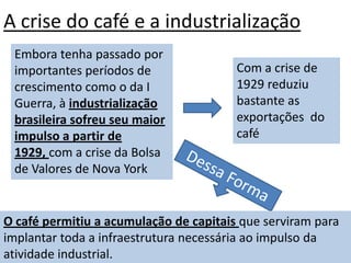 O documento descreve a história da industrialização no Brasil desde a crise do café em 1929 até as políticas de desenvolvimento regional no final do século XX. Resume os principais marcos como a substituição de importações na era Vargas, o Plano de Metas de JK que acelerou o crescimento, e a desconcentração gradual da indústria da região Sudeste para outras partes do país.