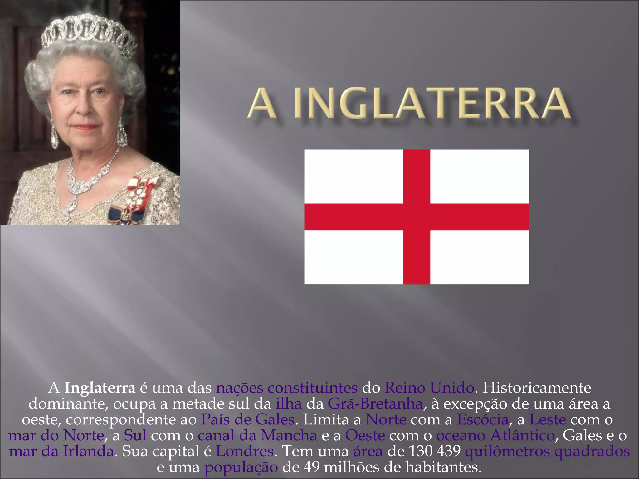 A Inglaterra é uma nação constitutiva do Reino Unido localizada na ilha da Grã-Bretanha. Tem Londres como capital e uma população de 49 milhões. Historicamente dominante no Reino Unido, a Inglaterra desenvolveu o idioma inglês e o sistema parlamentar adotados em outros países.