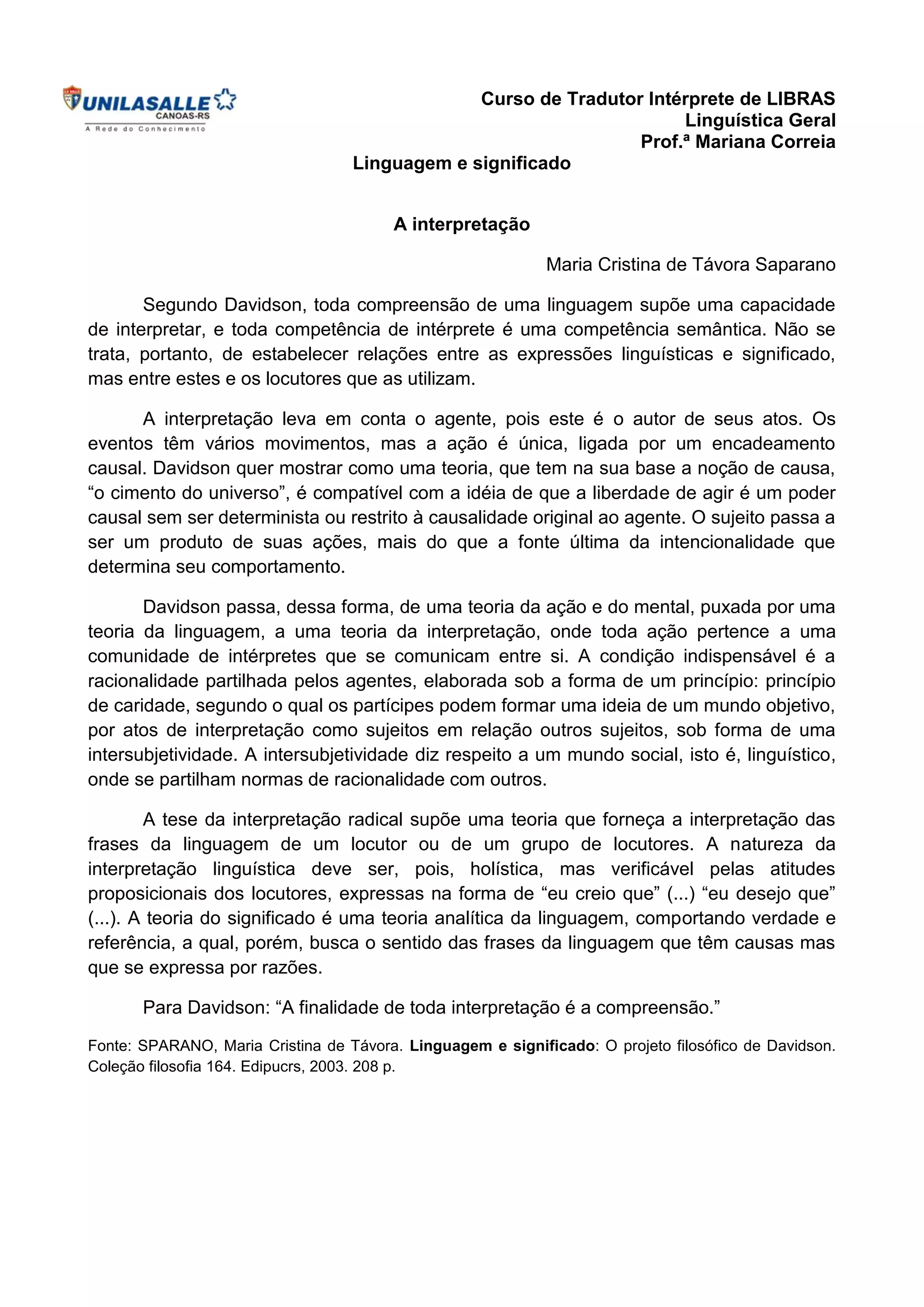 1) Segundo Davidson, a compreensão de uma linguagem requer a capacidade de interpretar, que é uma competência semântica que leva em conta o locutor, não apenas as expressões linguísticas.