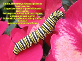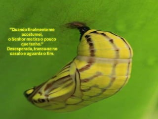 O documento fala sobre a transformação de uma lagarta em borboleta e como isso representa a vida e os desígnios de Deus. Também discute sobre como seguir os caminhos de Deus em vez de seguir os desejos enganosos do coração humano.