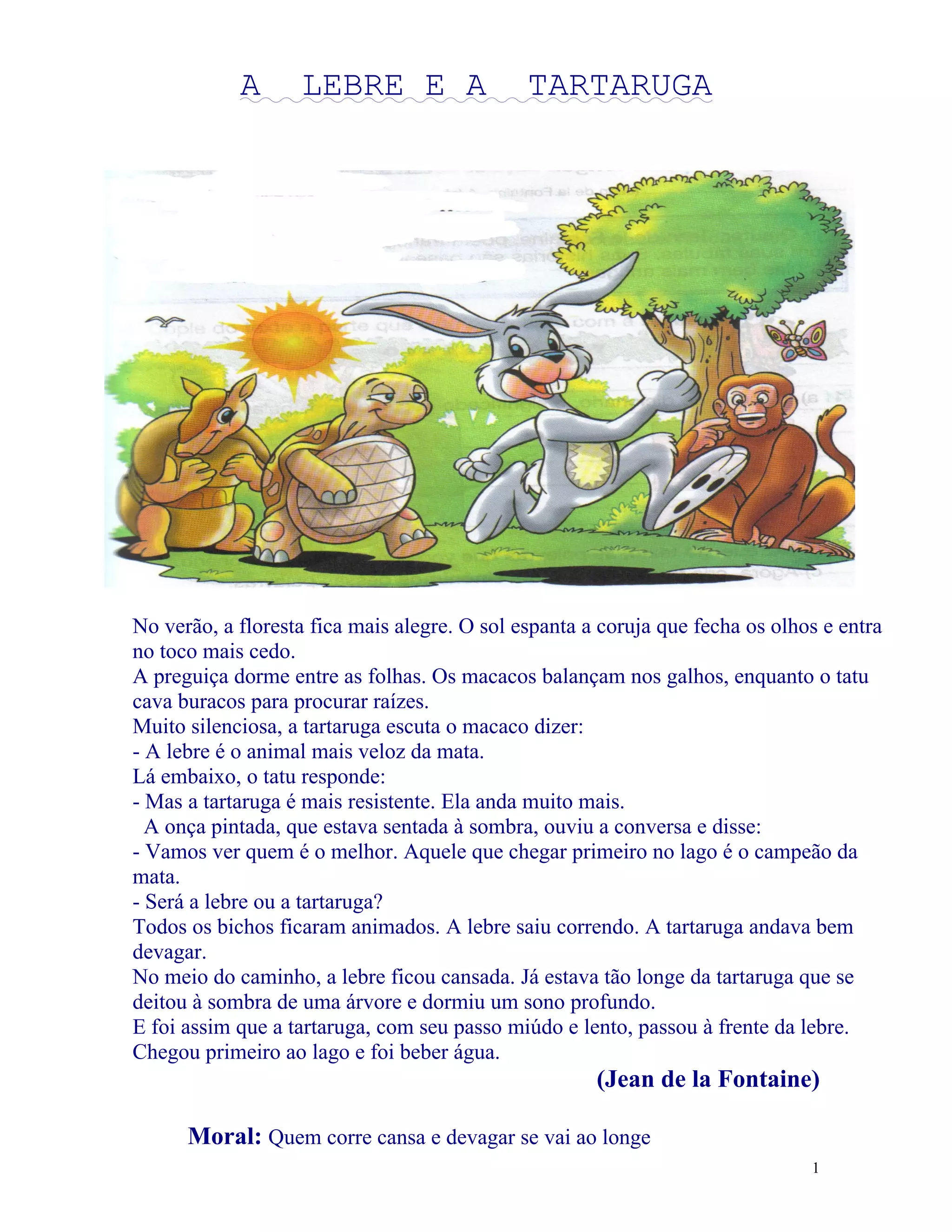 Este conto de fábulas narra uma corrida entre uma lebre e uma tartaruga para determinar qual é o animal mais rápido da floresta. A lebre sai na frente correndo rapidamente, mas logo fica cansada e dorme, permitindo que a tartaruga, que anda devagar mas constantemente, ultrapasse a lebre e ganhe a corrida. A moral da história é que a persistência e constância podem vencer a velocidade.