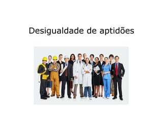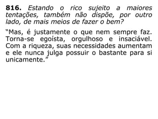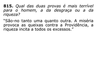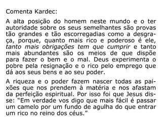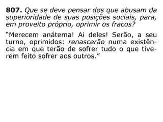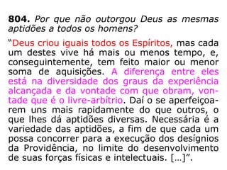 O documento discute a igualdade natural entre os homens segundo as escrituras e o Espiritismo. Aponta que, perante Deus, todos os homens são iguais, mas suas aptidões podem diferir devido ao grau de desenvolvimento espiritual alcançado. Também distingue entre desigualdades naturais e sociais, sendo estas últimas obra do homem e não de Deus, e que um dia podem desaparecer.