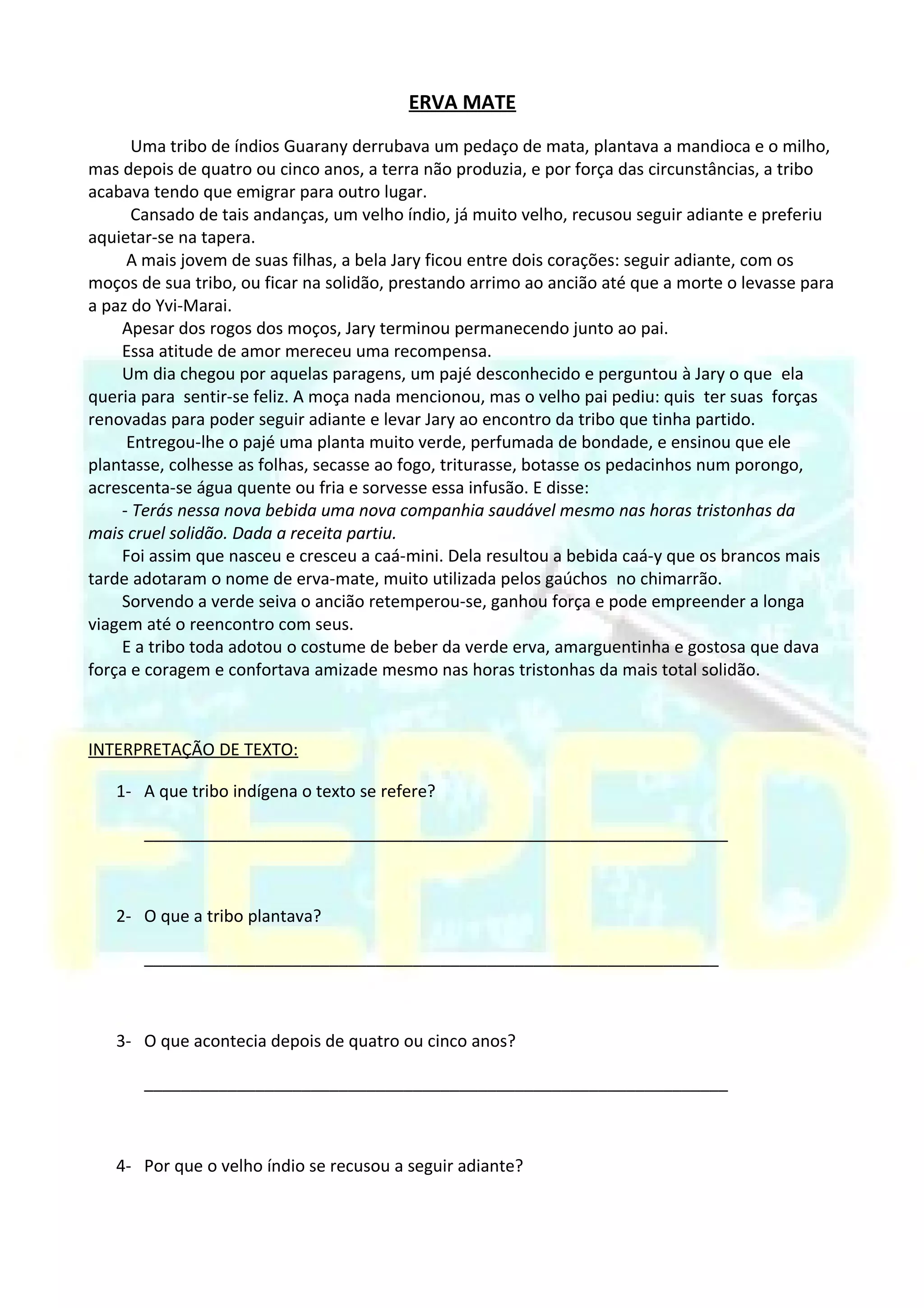 A tribo Guarani plantava mandioca e milho, mas a terra deixava de produzir após alguns anos, forçando a tribo a emigrar. Um velho índio recusou-se a emigrar e sua filha Jary ficou para cuidar dele. Um pajé deu a Jary uma planta para renovar as forças do pai, que se tornou a bebida erva-mate, usada pelos gaúchos no chimarrão.
