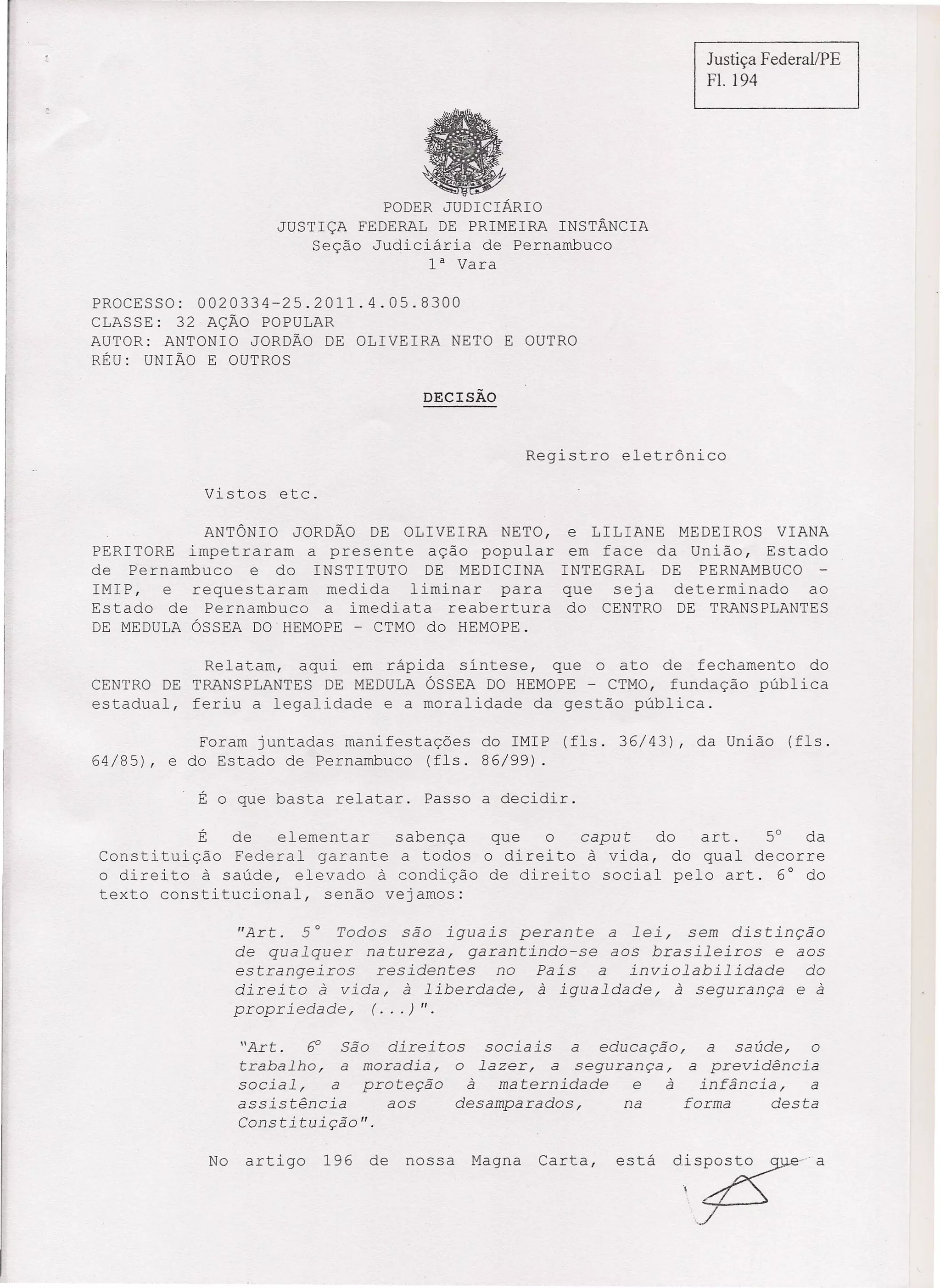 1) Uma ação popular foi proposta contra o fechamento do Centro de Transplantes de Medula Óssea do HEMOPE pelo Estado de Pernambuco.
