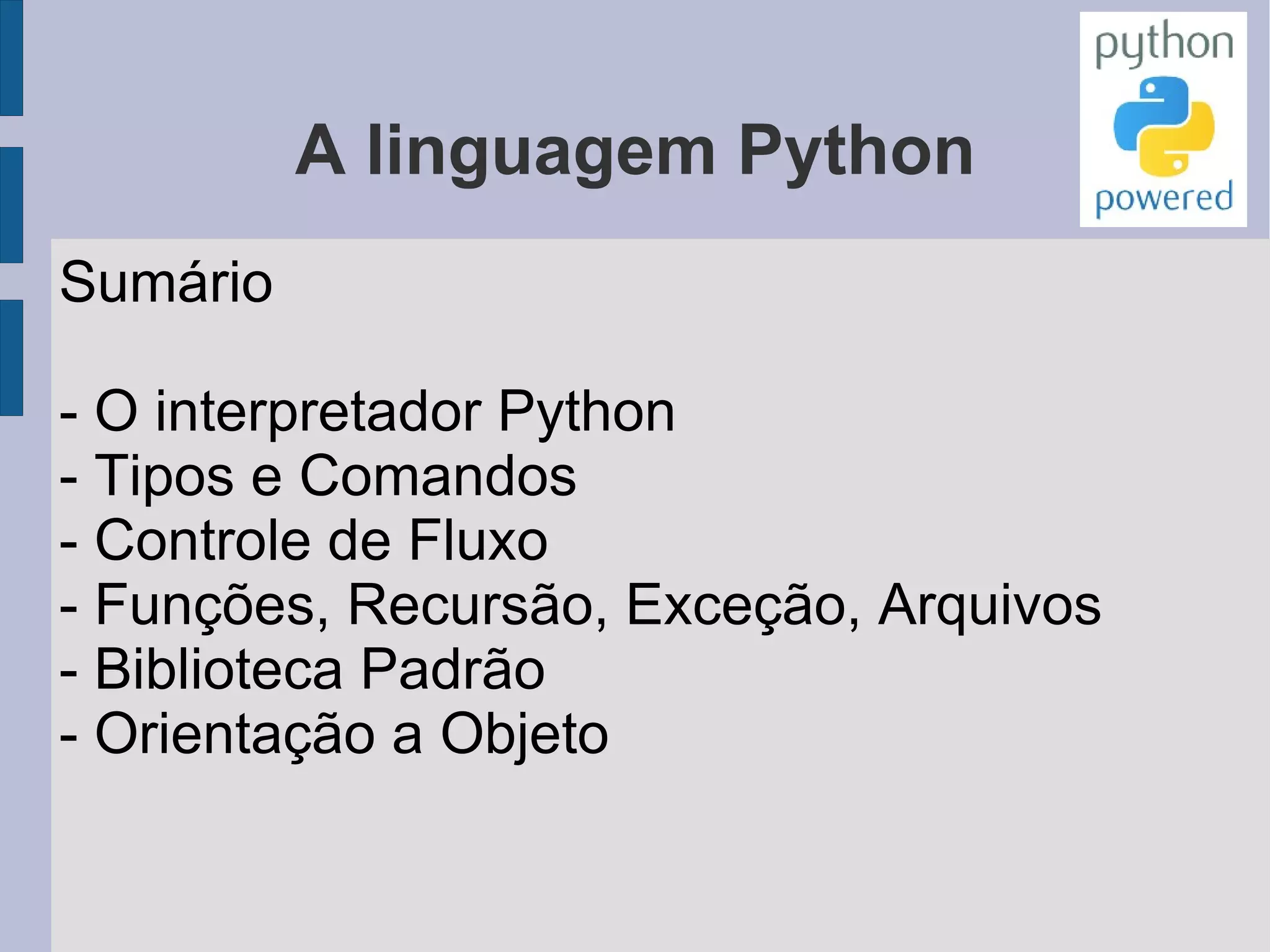 1) O documento discute a linguagem de programação Python, incluindo seus tipos de dados, operadores, controle de fluxo, funções, módulos e orientação a objetos.