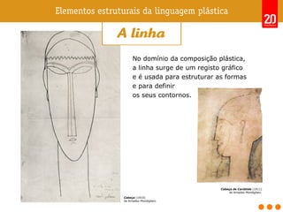 O documento discute a linha como o segundo elemento estrutural da linguagem plástica, resultando de uma sucessão de pontos próximos. Explora diversos tipos de linhas e como elas são usadas para estruturar formas, definir contornos, indicar linhas de força e tensão, e sugerir movimento, estabilidade, crescimento e volume através de composições.