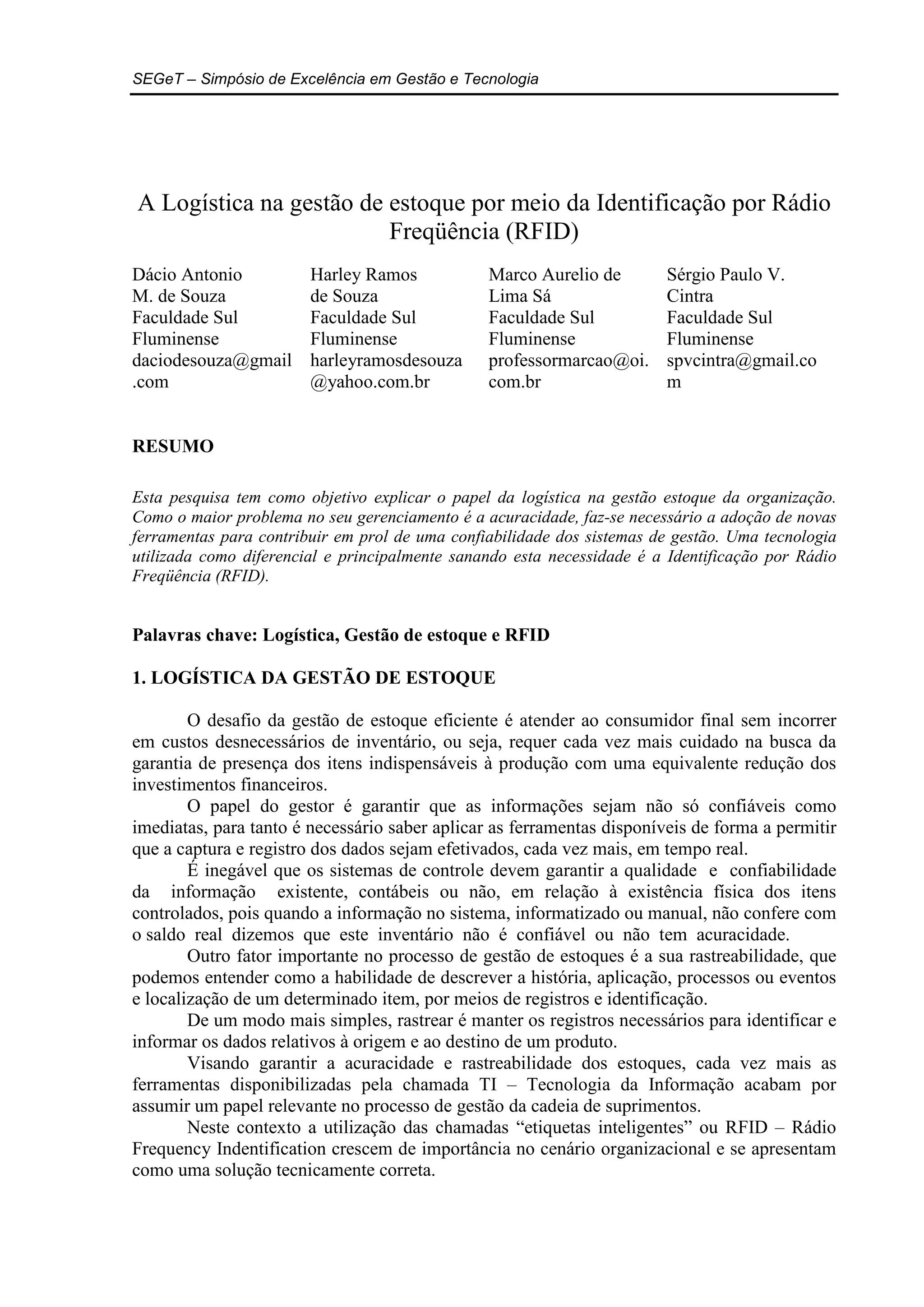 Este documento discute o uso da tecnologia RFID para melhorar a gestão de estoques nas organizações. Apresenta os desafios da gestão de estoques, como a falta de acurácia nas informações, e argumenta que a RFID pode ajudar a fornecer dados em tempo real e mais confiáveis sobre os níveis de estoque. Também discute os custos e benefícios de manter estoques e a importância de se ter uma boa gestão dos mesmos.
