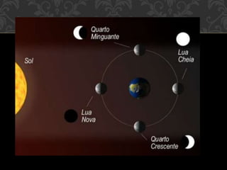 O documento descreve as características e movimentos da Lua. A Lua é o satélite natural da Terra, com mais de 3.470 km de diâmetro e uma distância média de 384.400 km da Terra. Ela influencia a gravidade e as marés na Terra e possui fases como Lua Nova, Quarto Crescente, Lua Cheia e Quarto Minguante.