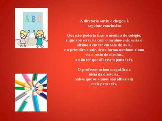A diretoria ouviue chegou à seguinte conclusão:Que não poderia tirar o menino do colégio, e que conversaria com o menino e ele seria o ultimo a entrar em sala de aula, e o primeiro a sair, desta forma nenhum aluno via o rosto do menino, a não ser que olhassem para trás.O professor achou magnífica a idéia da diretoria, sabia que os alunos não olhariam mais para trás.