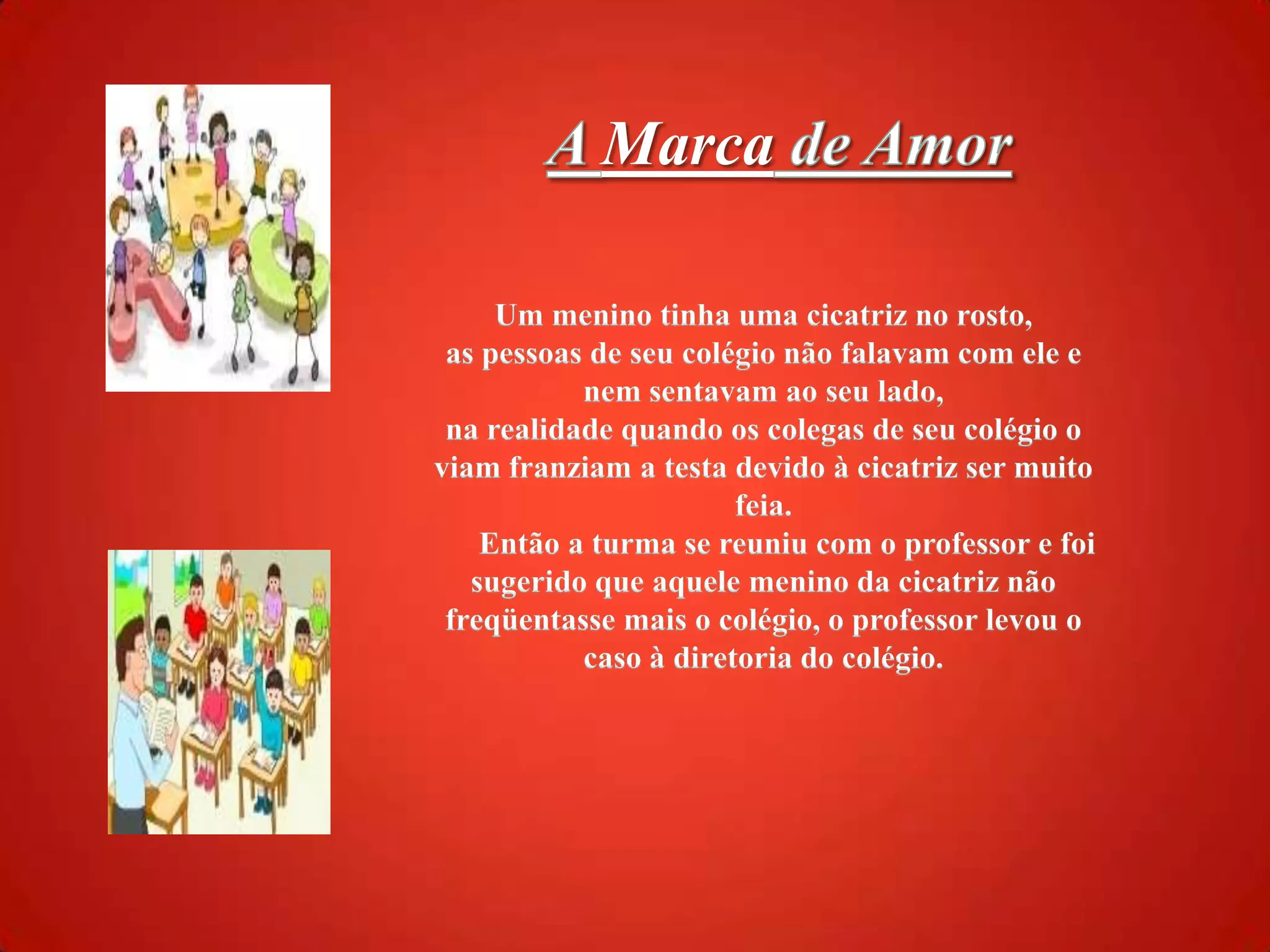 A Marca deAmorUm menino tinha uma cicatriz no rosto, as pessoas de seu colégio não falavam com ele e nem sentavam ao seu lado, na realidade quando os colegas de seu colégio o viam franziam a testa devido à cicatriz ser muito feia. Então a turma se reuniu com o professor e foi sugerido que aquele menino da cicatriz não freqüentasse mais o colégio, o professor levou o caso à diretoria do colégio.
