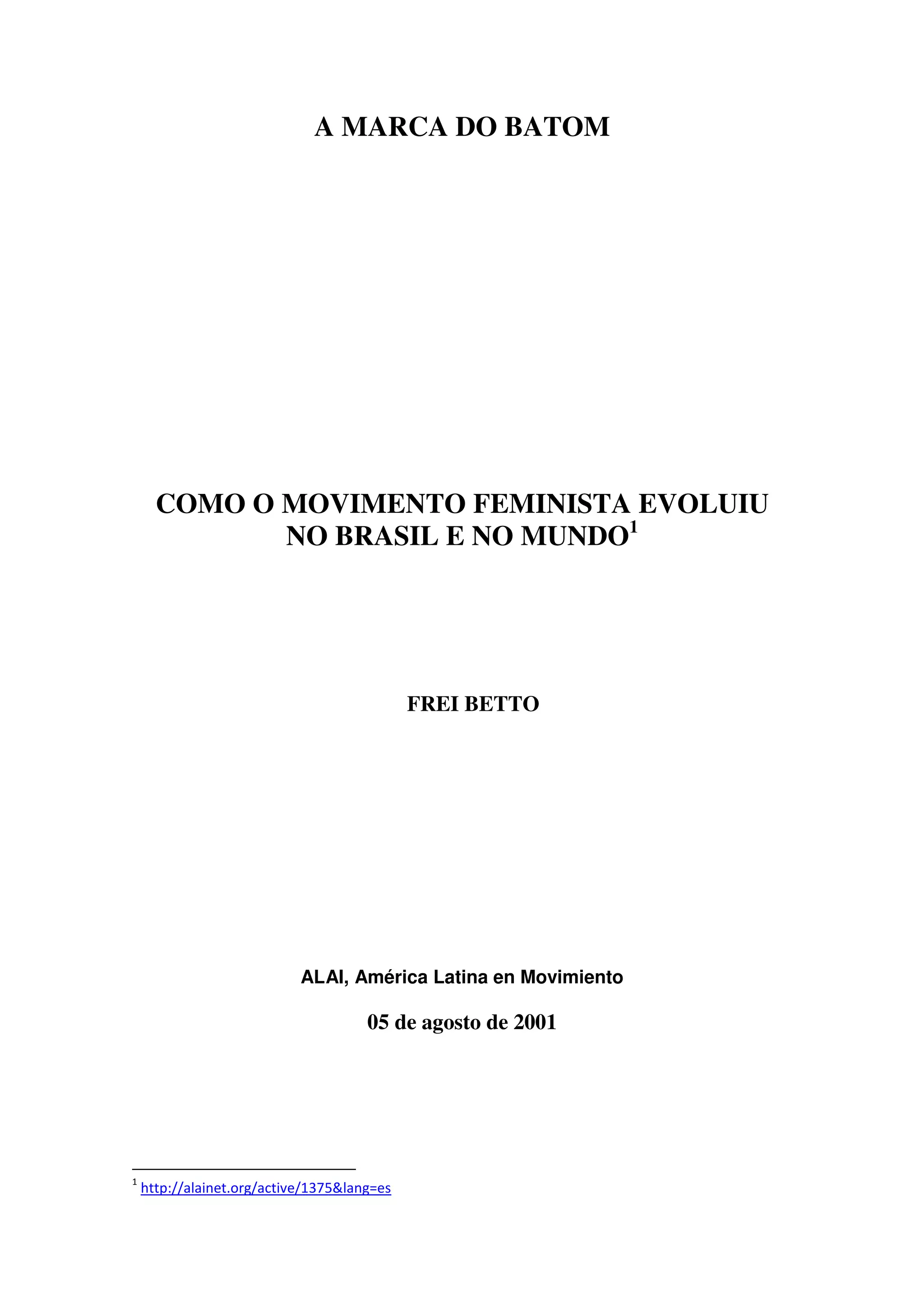 O documento descreve a evolução do movimento feminista no Brasil e no mundo. Começou nos EUA na década de 1960 defendendo a libertação, e não apenas a emancipação, da mulher. No Brasil, o primeiro grupo organizado surgiu em 1972 em São Paulo. Ao longo das décadas de 1970 e 1980, o movimento cresceu e diversificou, incluindo questões de raça, classe e orientação sexual. Sindicatos também passaram a defender direitos das trabalhadoras nessa época.