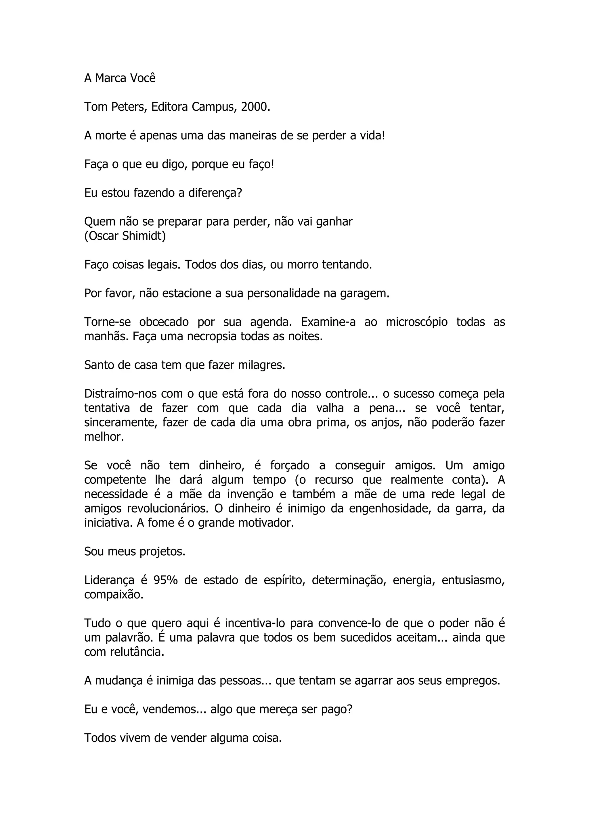 O documento apresenta várias citações sobre a importância de se destacar no trabalho, de se dedicar aos projetos, de cultivar relacionamentos e de buscar a mudança. Algumas frases enfatizam que o sucesso vem da tentativa de fazer cada dia valer a pena e de se tornar obcecado pela agenda, e que a fome é um grande motivador quando se falta dinheiro e amigos.