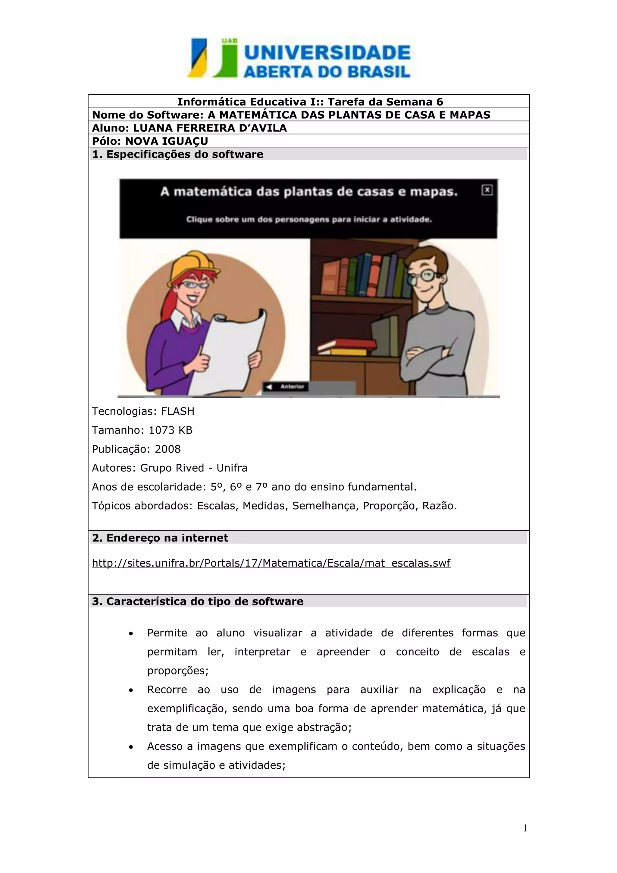 Este documento descreve um software educativo chamado "A MATEMÁTICA DAS PLANTAS DE CASA E MAPAS" que ensina conceitos matemáticos como escalas, medidas e proporção para alunos do 5o ao 7o ano. O software é gratuito, está disponível online, utiliza flash e permite atividades interativas com feedback para praticar os tópicos abordados.