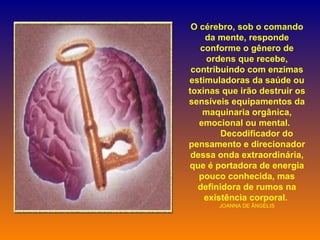 O documento discute a mente e seu relacionamento com o cérebro. Explica que o cérebro responde aos comandos da mente, afetando a saúde ou toxinas no corpo. Descreve também as diferentes partes da mente, incluindo o consciente, inconsciente e subconsciente, mapeando cada um a diferentes áreas do cérebro. Finalmente, discute como a mente guia as funções do corpo através do comando mental.