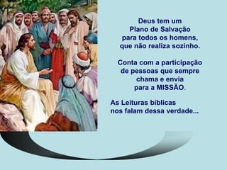 Este documento fala sobre a missão de Deus e a necessidade de pessoas para realizá-la, destacando a missão de Israel, de Jesus Cristo e dos doze apóstolos. Enfatiza que os discípulos de Jesus são chamados a libertar os oprimidos e a combater estruturas que geram miséria e exclusão, enfatizando a importância de serem sinais do amor de Deus. A 38ª Semana do Migrante também é mencionada, com ênfase na relação entre migração e soberania alimentar.