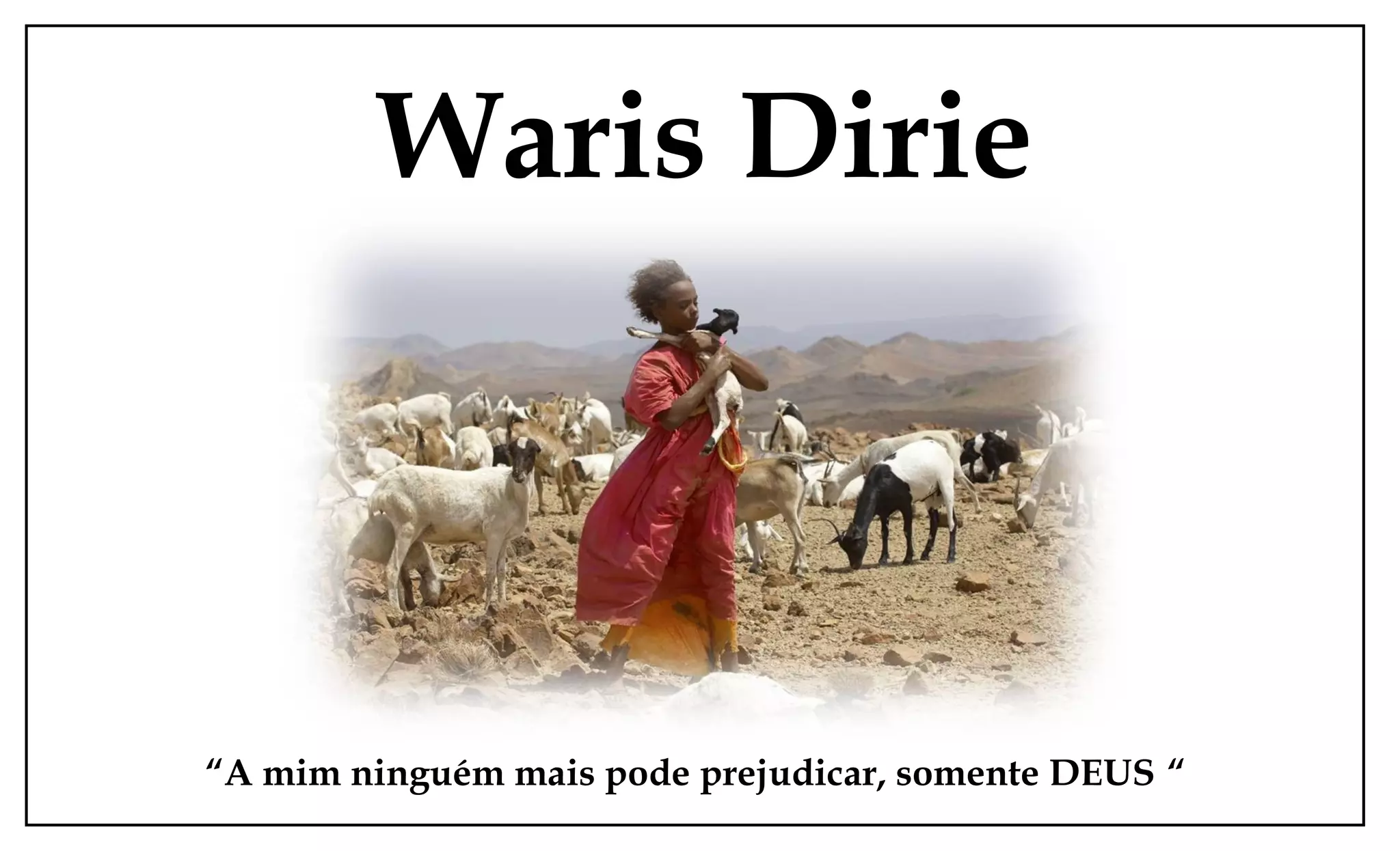 Waris Dirie é uma modelo somali que escapou de um casamento forçado aos 13 anos e se tornou ativista contra a mutilação genital feminina. Ela escreveu vários livros sobre sua vida e viaja o mundo lutando contra a ablação. Atualmente é embaixadora da ONU e fundou a organização Desert Dawn para acabar com a violência contra mulheres.