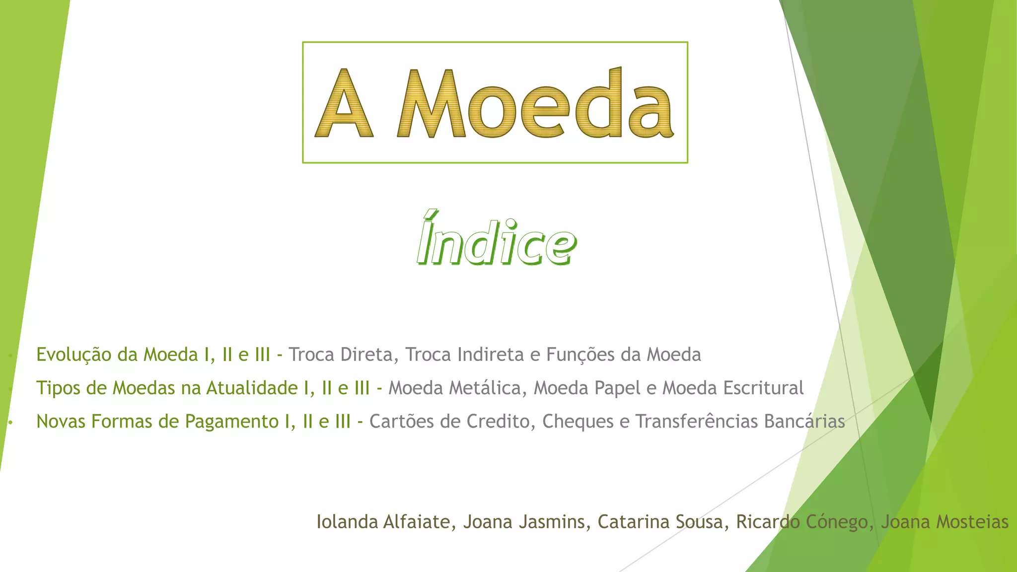 O documento discute a evolução da moeda e as formas de pagamento atuais. Apresenta a troca direta e indireta, as funções da moeda, os tipos de moedas (metálica, papel e escritural) e novas formas de pagamento como cartões de crédito, cheques e transferências bancárias.