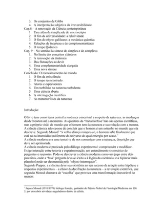 1. O livro descreve a mudança conceitual da ciência desde Newton até o momento atual, mostrando como a visão do homem em relação à natureza se transformou.