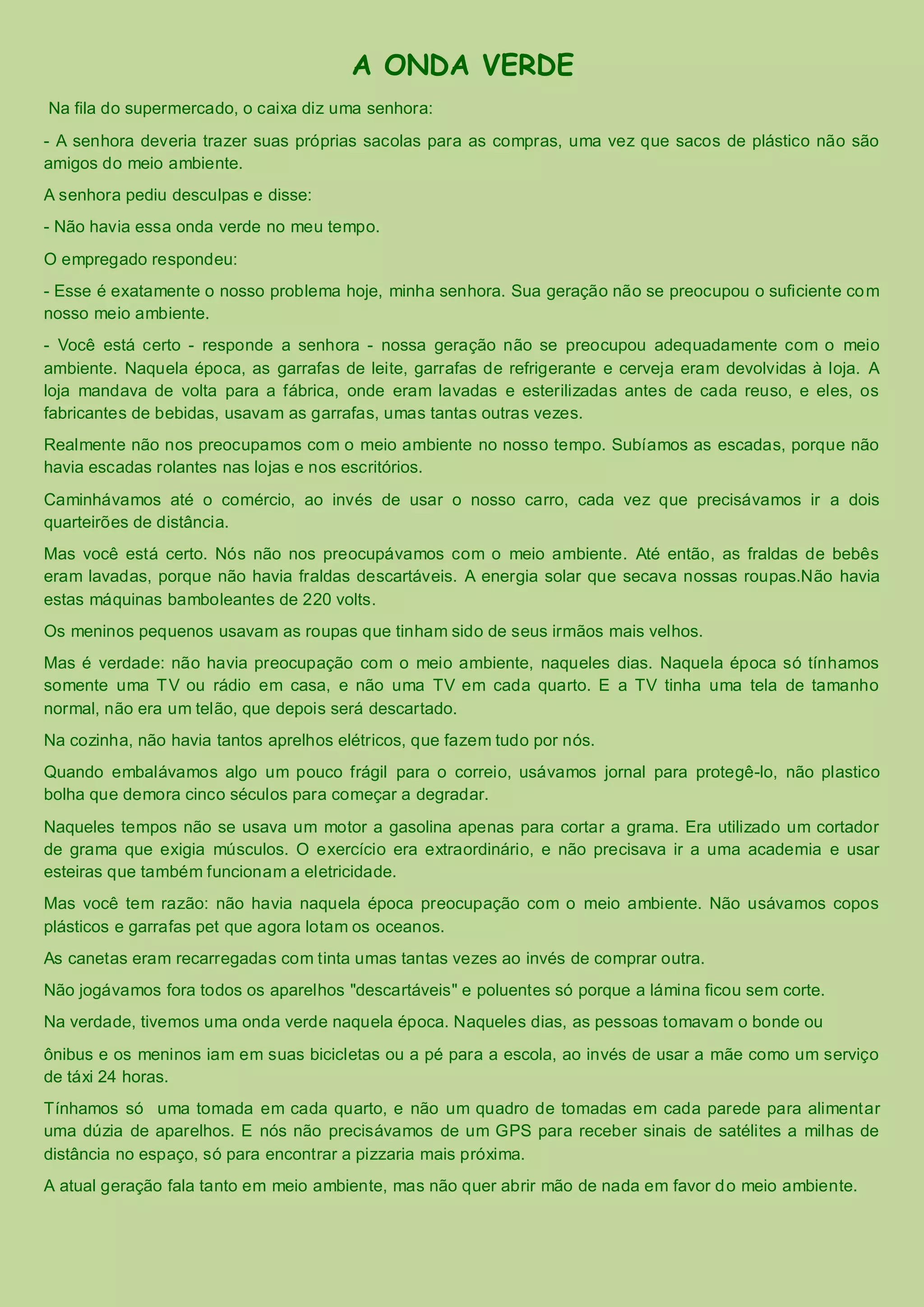 O diálogo entre o caixa e a senhora no supermercado levanta a questão da falta de preocupação com o meio ambiente nas gerações passadas. A senhora reconhece que sua geração não se preocupou adequadamente com o meio ambiente, citando como exemplo o reuso de garrafas e o uso de menos aparelhos elétricos. No entanto, a senhora também aponta que em seu tempo havia hábitos mais sustentáveis, como o uso de transporte público, menos descartáveis e maior reuso de objetos.