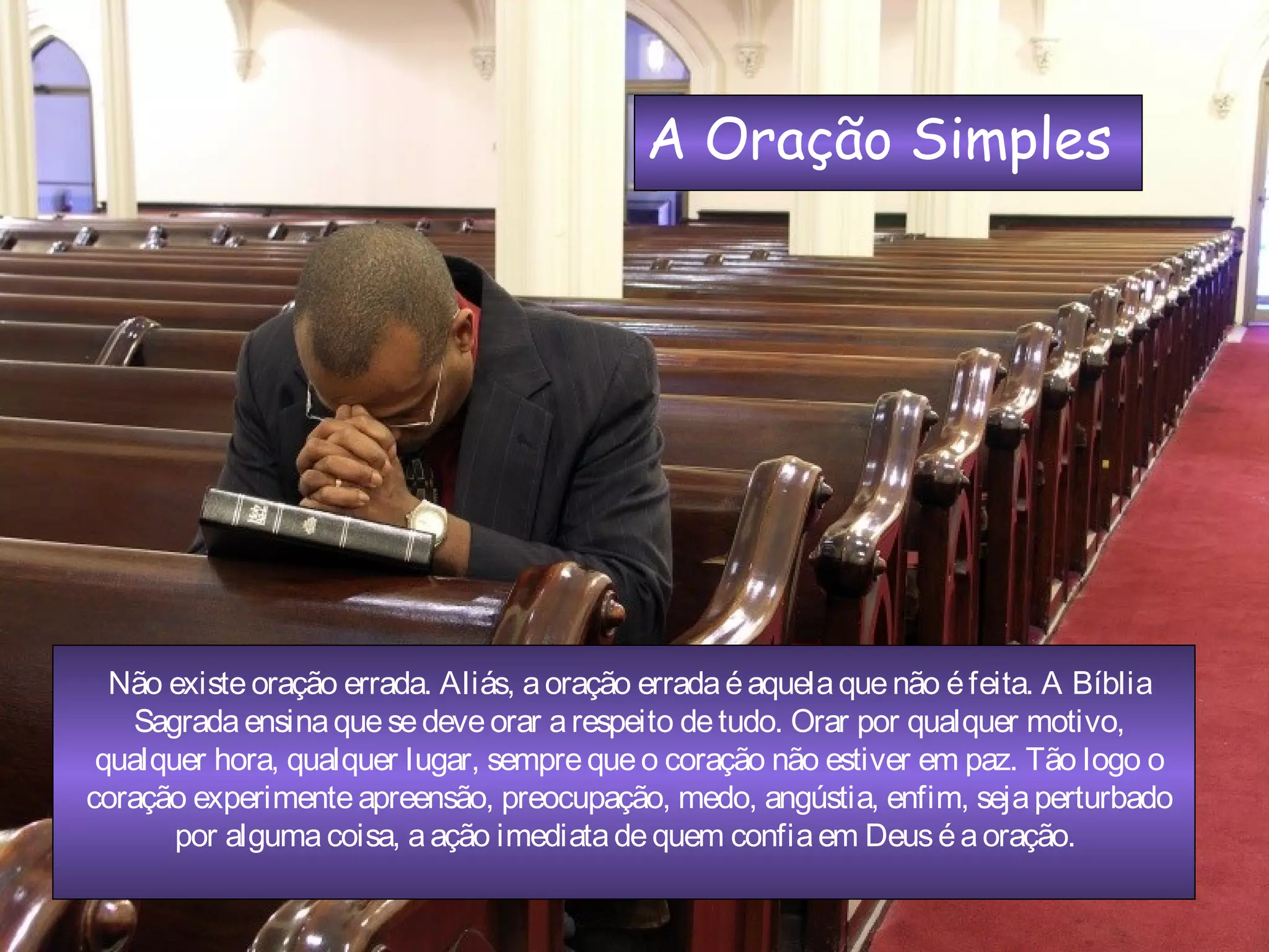O documento discute a importância da oração simples, sem questionamentos, sobre qualquer assunto. A oração simples traz paz ao coração, mesmo que os pedidos não sejam atendidos da forma como foram feitos. O maior fruto da oração é a maturidade espiritual da pessoa que ora, não os resultados obtidos.