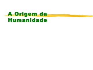 O documento discute a origem da humanidade, começando com o mais antigo ancestral conhecido, o Australopithecus. A Terra se formou há bilhões de anos e as primeiras formas de vida surgiram há milhões de anos. Os primeiros seres humanos surgiram a cerca de 4,2 milhões de anos atrás e eram diferentes de nós. Fósseis e vestígios culturais são fontes importantes para estudar os primeiros habitantes da Terra.