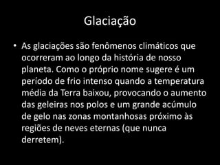 Glaciações ocorreram ao longo da história da Terra, levando à evolução de espécies humanas como o Australopithecus e Homo Habilis. O Homo Erectus descobriu como fazer fogo. O Homo Sapiens desenvolveu habilidades de caça e coleta. Uma elevação das temperaturas levou ao desenvolvimento da agricultura cerca de 10.000 anos atrás.