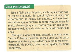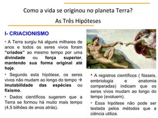 1) O documento discute três hipóteses sobre a origem da vida: criacionismo, cosmogênese e evolução química.