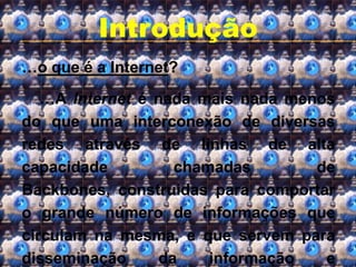 O documento discute a origem e evolução da Internet, desde sua criação como a ARPANET até o desenvolvimento do TCP/IP e da World Wide Web. Detalha os principais usos e ferramentas da Internet, como navegadores, motores de busca, e-mail, e descreve brevemente termos como URL, HTTP, FTP e intranet.