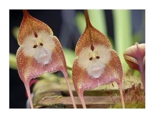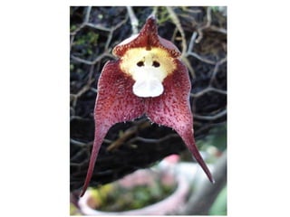 O documento descreve a orquídea Drácula símia, nativa do Equador e Peru, que tem flores com formato de rosto de macaco. A orquídea só foi descrita cientificamente em 1978 e é difícil de cultivar, requerendo sombra parcial e umidade. A família das orquídeas é extremamente diversa, com mais de 25.000 espécies descritas.