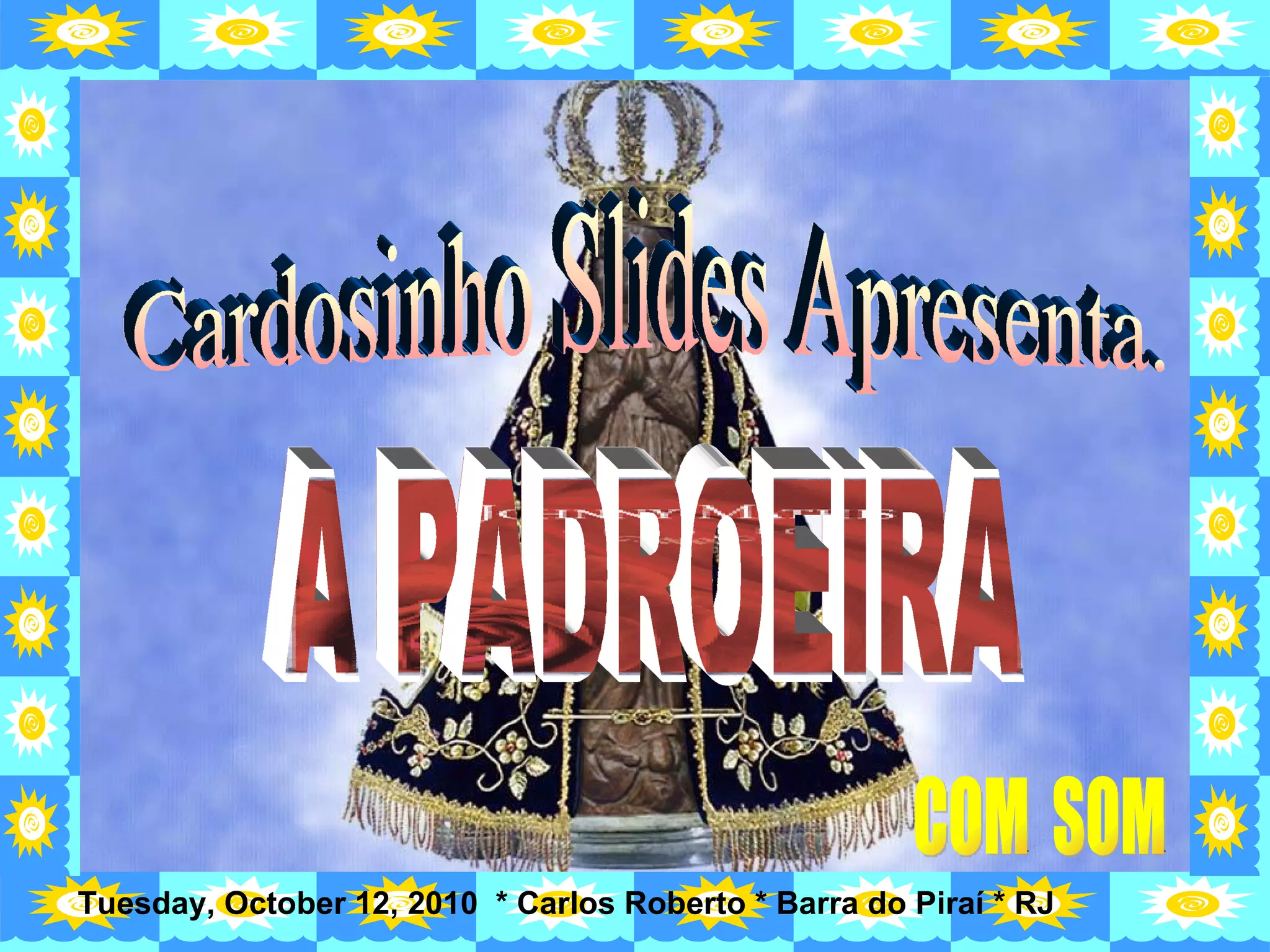 O documento celebra Nossa Senhora Aparecida, a padroeira do Brasil. Fala sobre sua veneração e pede que continue a abençoar o povo brasileiro e ouvir suas preces, conduzindo-os ao céu livres da culpa. Pede também que compartilhe a imagem da Virgem pelos amigos para continuar suas visitas e abençoá-los.