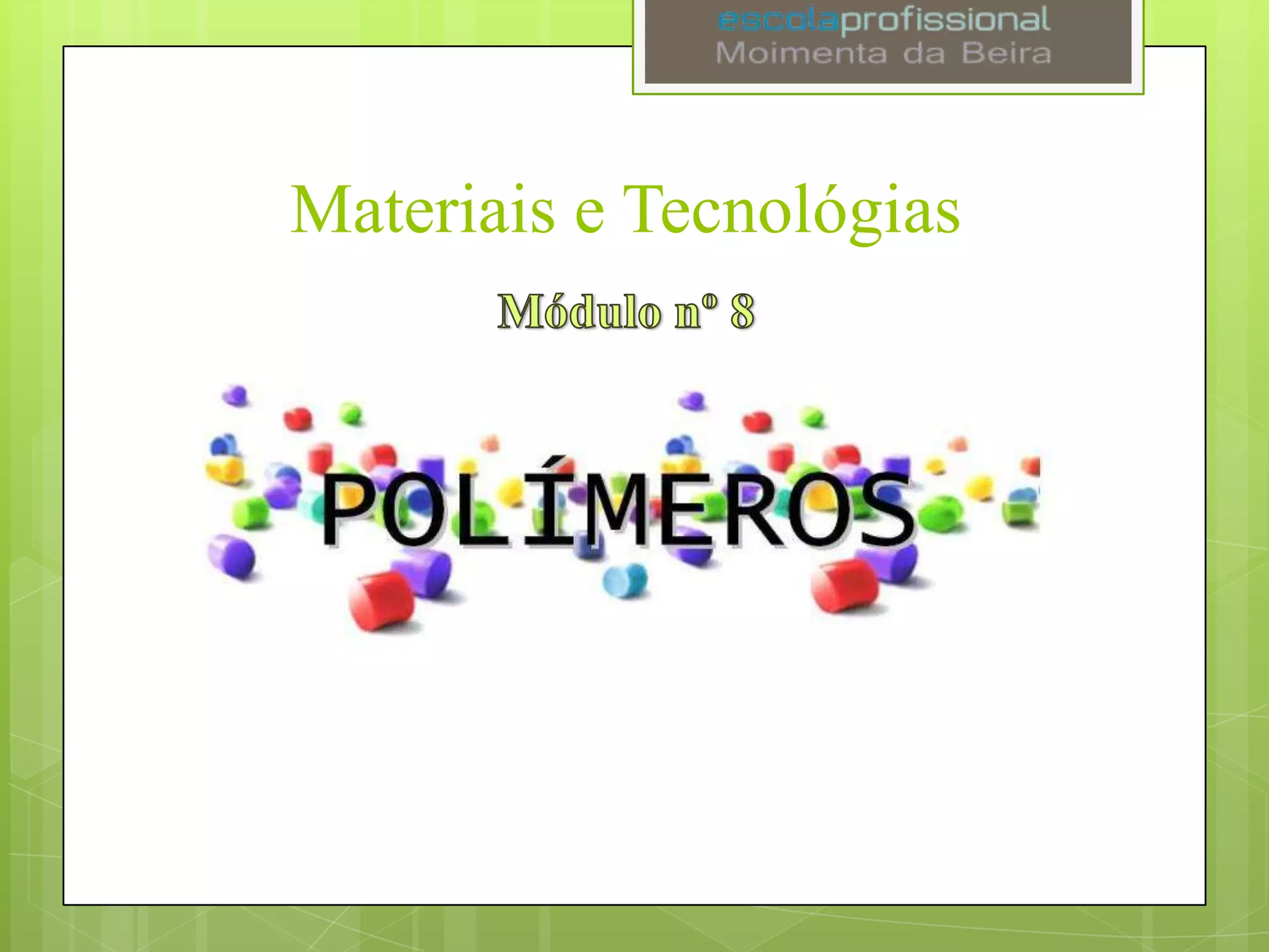 O documento discute polímeros, incluindo sua definição como macromoléculas formadas pela repetição de unidades menores chamadas monômeros, e sua classificação de acordo com origem, estrutura e propriedades mecânicas. Exemplos de polímeros comuns como polietileno, poliestireno e polipropileno são dados junto com suas aplicações comuns.