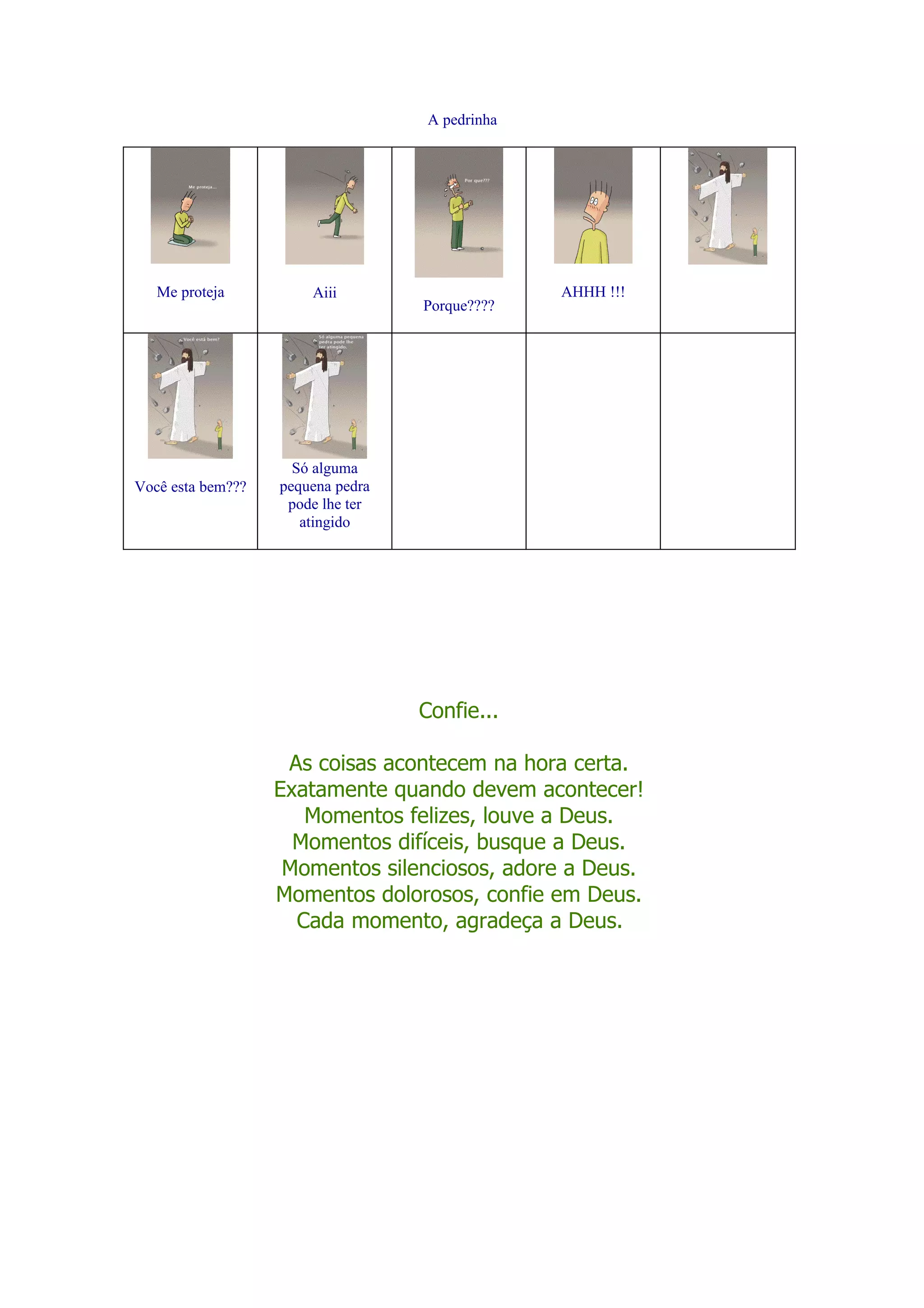 Uma pessoa foi atingida por uma pequena pedra e ficou assustada, mas outra pessoa a conforta dizendo que as coisas acontecem no momento certo determinado por Deus, e que em todos os momentos da vida devemos louvar, buscar, adorar, confiar e agradecer a Deus.