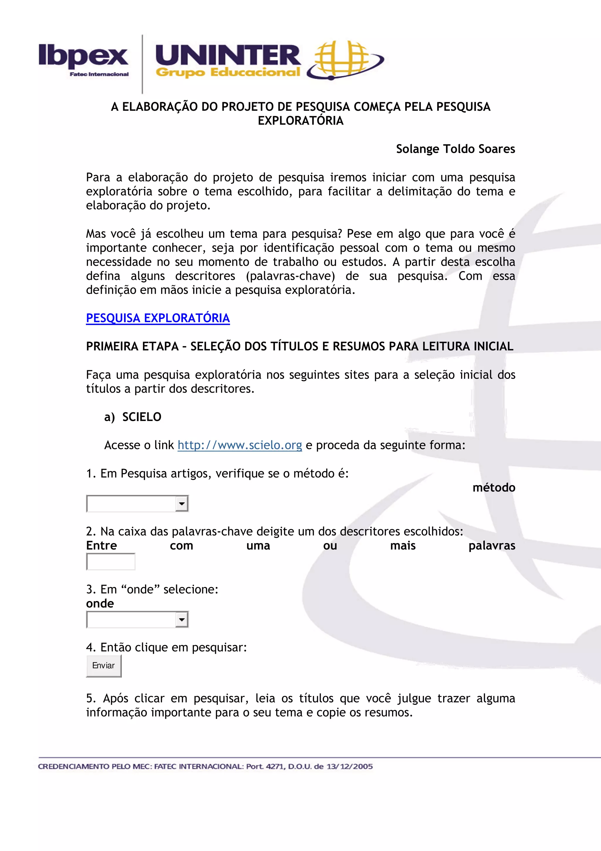 Este documento fornece instruções em 4 etapas para realizar uma pesquisa exploratória que irá auxiliar na elaboração de um projeto de pesquisa, começando pela seleção de títulos e resumos em sites como a Scielo, ANPED e CAPES, seguida pela leitura completa de artigos, fichamento dos mesmos e por fim a elaboração de uma revisão de literatura para delimitar o tema da pesquisa.