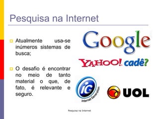 O documento fornece dicas sobre como realizar pesquisas na internet de forma eficiente e segura. Ele explica que os mecanismos de busca não vasculham a internet diretamente, mas buscam em um banco de dados pré-selecionado. Também dá dicas sobre o uso de palavras-chave, refinamento de pesquisas, otimização de termos, salvamento de dados e cuidados com plágio.